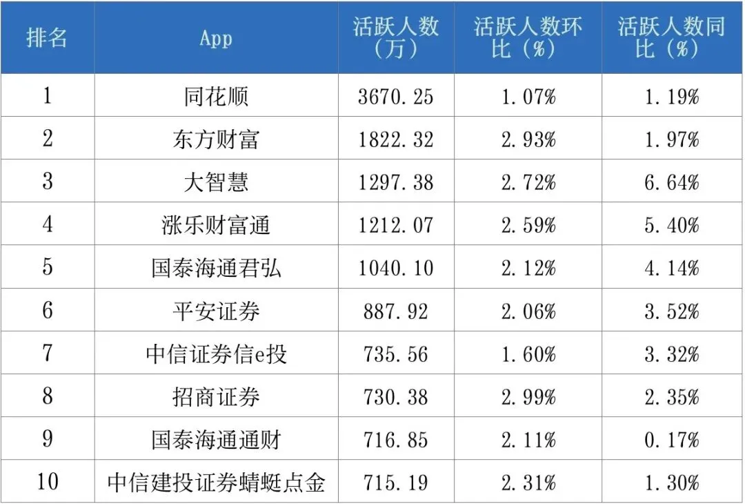 券商自营的App中,华泰证券涨乐财富通以1143.56万的月均活成为券商App的“领头羊”;紧随其后的依次为国泰海通君弘、平安证券、中信证券信e投、招商证券。此外,国泰海通海财、中信建投证券蜻蜓点金、广发证券易淘金、方正证券小方、中国银河证券、中泰齐富通等App平均月活均超过600万。
