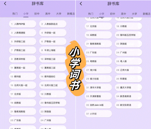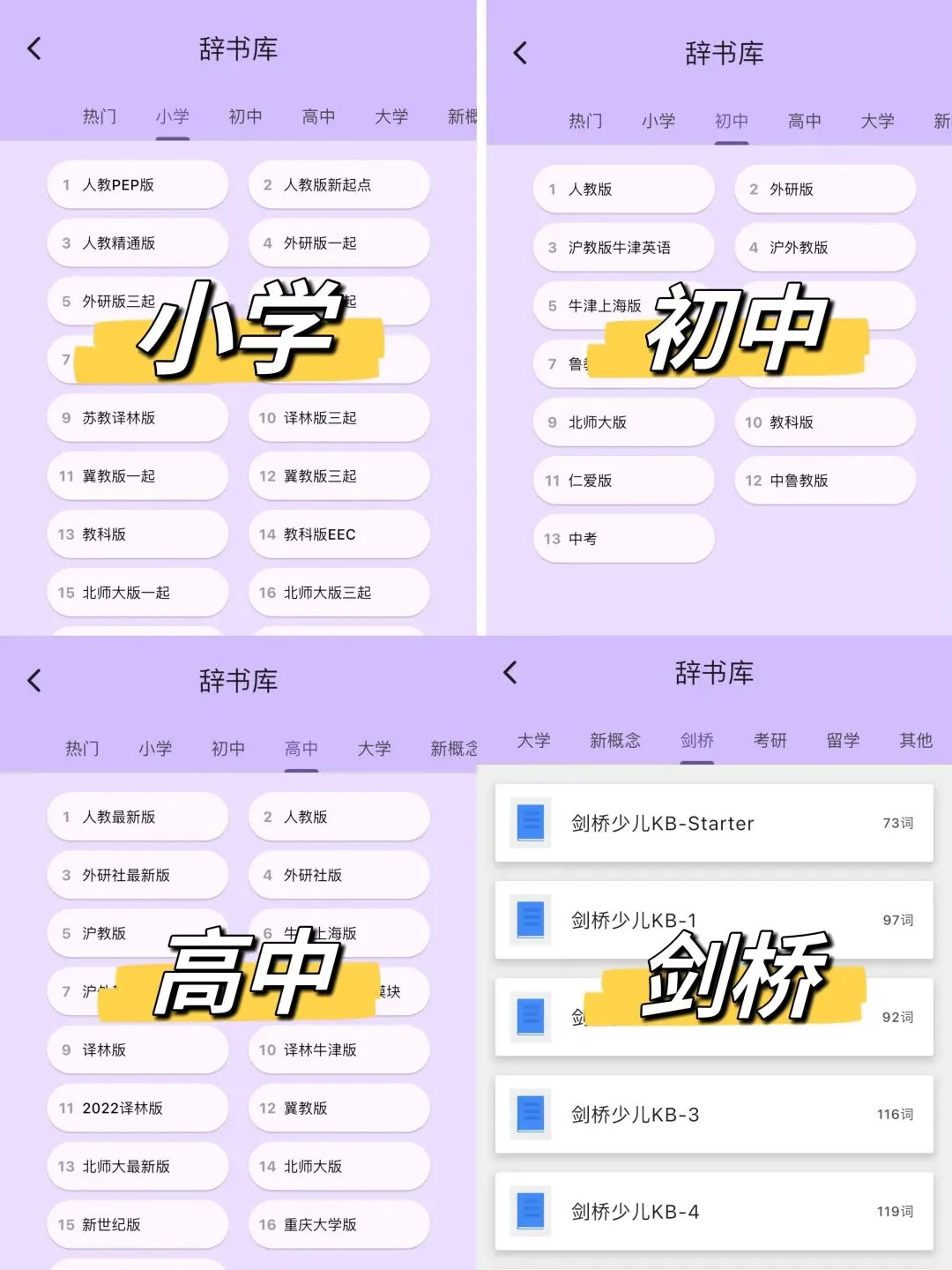 超级单词表内置了900+本的词书,覆盖了小初高、大学、考研、剑桥(包括KET 、PET、FCE等)、留学等各个阶段。