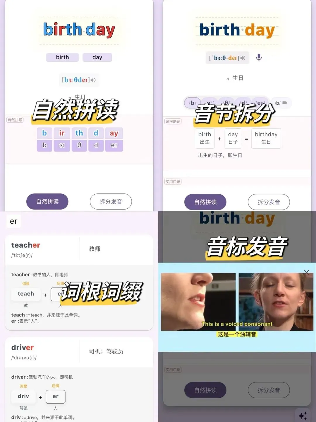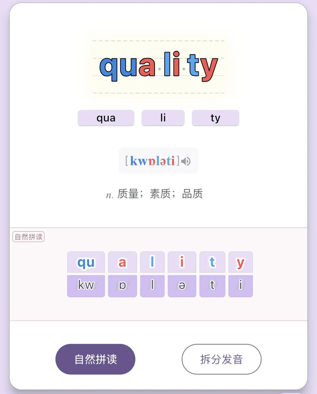 长难单词变成短音节,更易于孩子记忆。同时也能帮助孩子理解单词的结构和组成,提升拼写能力。