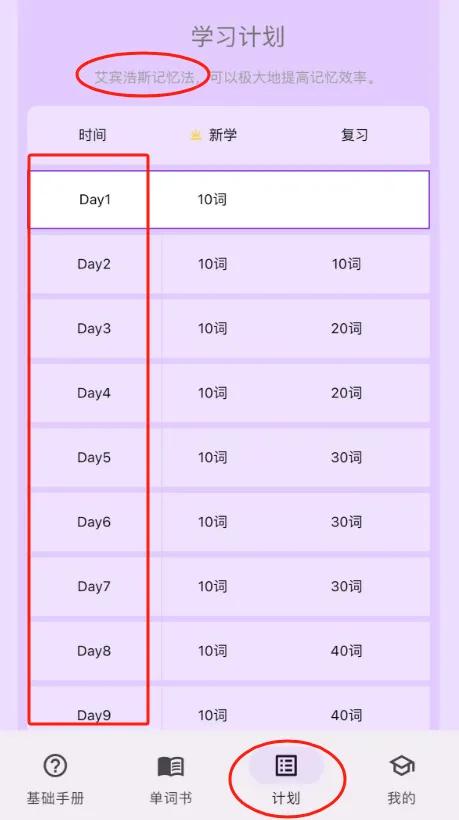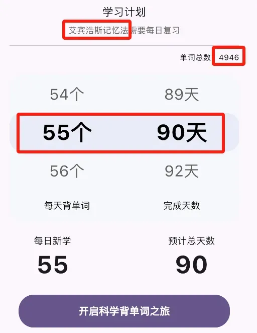 这里系统会自动计算每天至少需要背诵的单词量,并且单词的记忆也是根据艾宾浩斯记忆曲线进行的,能记得非常牢固!!