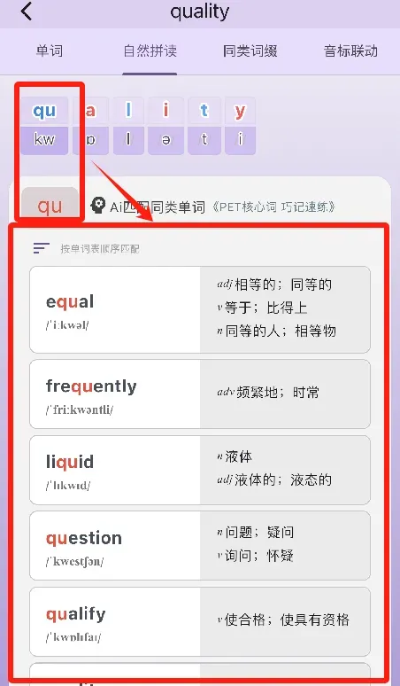并且可以通过点击不同的字母进行精准发音,然后就能直接为孩子匹配相同发音的其他单词,实现一音多学的效果。