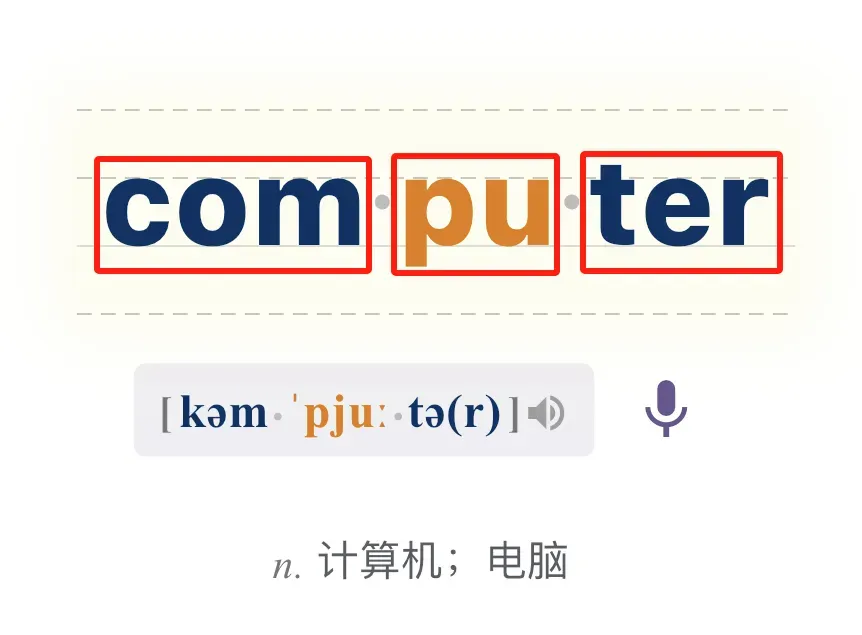 音节拆分法,即将长难单词按照音节划分,这样就将长单词划分为短单词了,比如computer这个单词,按照音节就可以拆分为——