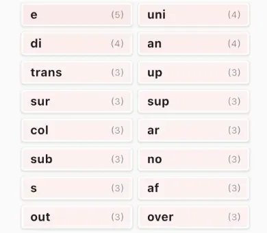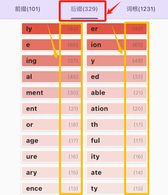 并且更让我惊喜的是,超级单词表还对单词通过统计的方式进行分类,不仅将需要学到的词根词缀汇总出来,还有频率的区分!