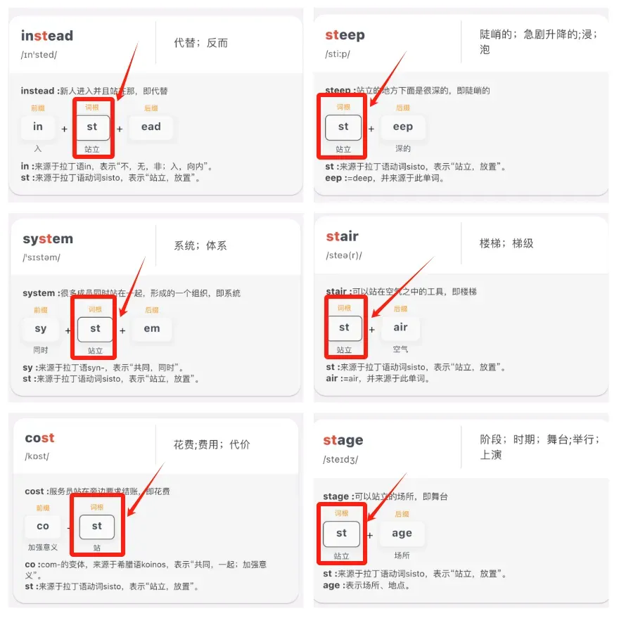 比如“st”这个词根,是“站立”的意思。这个词根在PET核心词汇中主要有6个单词需要记忆。
