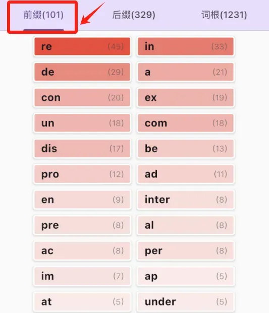 这是后缀汇总,并且大家还可以看到,每类后缀所需要学习的具体词汇数量,点击进去可以直接按照词根词缀学单词。