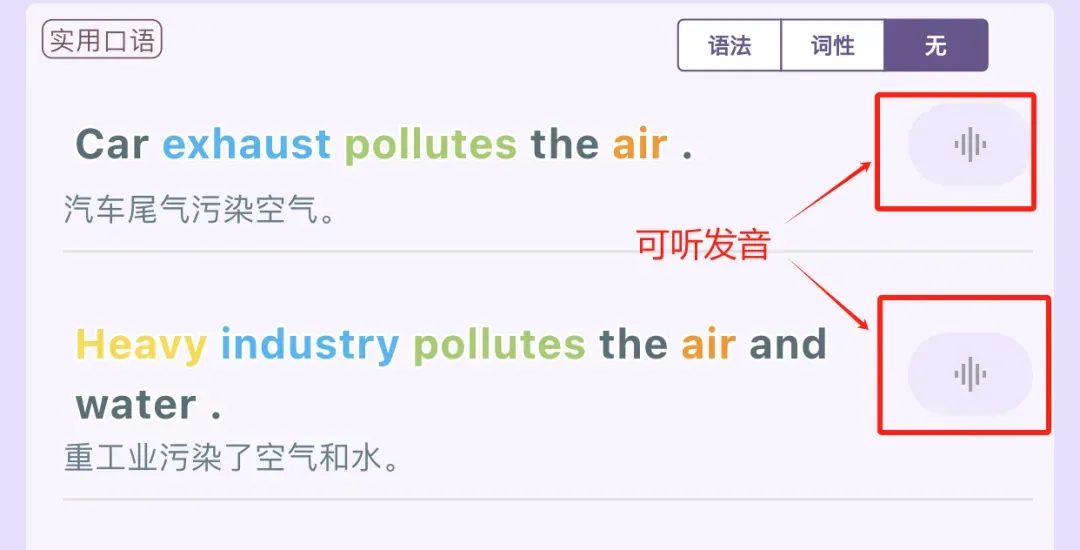 在超级单词表中,有一项是实用口语的功能,还配有句子发音,方便孩子跟读。