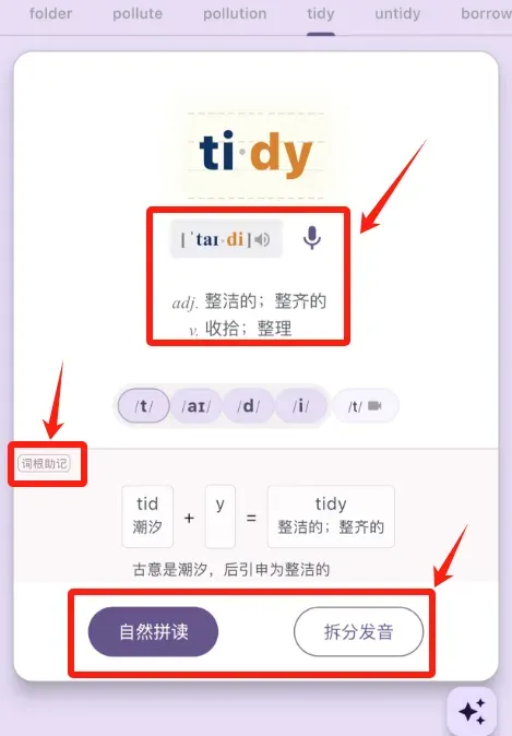 除了单词的基本意思和发音外,还有词根助记帮助孩子加深理解记忆,以及自然拼读和拆分发音帮助孩子学习发音。