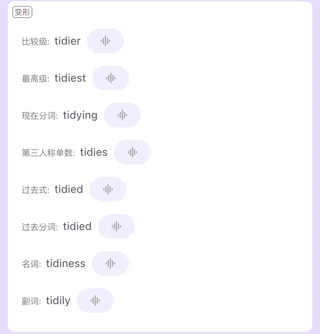 这里有单词的变形,孩子在考试中常用的变形,比如比较级、现在分词、第三人称单数等等这里都有,并且还有发音。