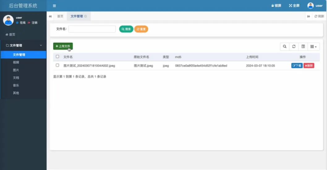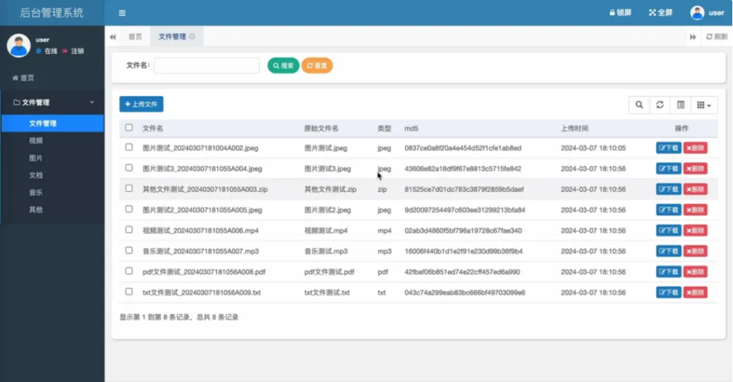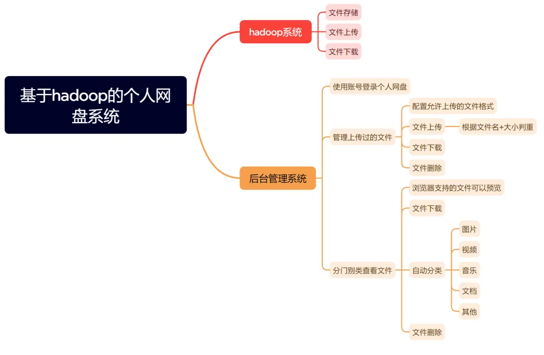系统核心功能分为存储引擎与后台管理两大部分。存储引擎层基于Hadoop实现,负责文件的物理分布式存储、多副本容灾保障以及高吞吐量的上传与下载。后台管理层提供完整的网盘应用功能,包括用户账号登录与数据隔离、可配置的上传文件格式策略、基于文件名与大小校验的文件上传、全面的文件管理(列表、下载、删除)、以及图片、视频等浏览器支持文件的在线预览。系统还集成了智能文件分类功能,可自动将文件按音乐、文档、图片等类型分门别类展示,极大提升了文件管理效率。通过将HDFS的企业级存储能力与易用的Web管理界面相结合,系统在保证数据高可靠性与海量扩展性的同时,提供了媲美商业网盘的流畅用户体验。