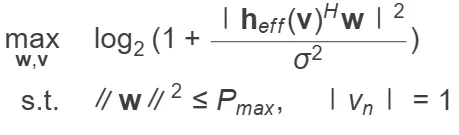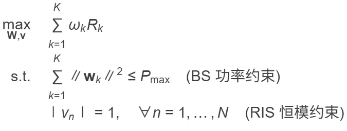 目标是联合设计波束赋形矩阵 W 和 RIS 相位 v 以最大化加权和速率: