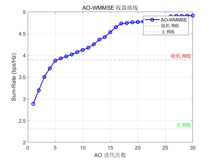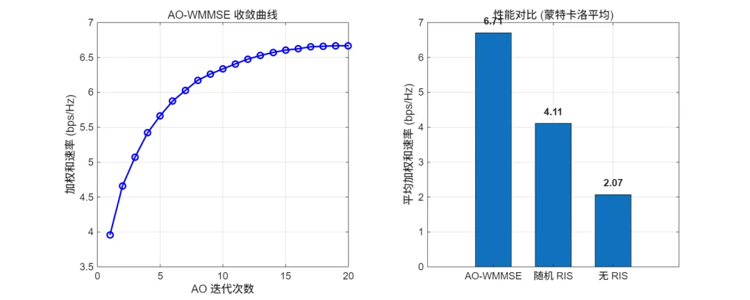 WMMSE (波束赋形) + AO-BCD (RIS 相位优化,使用穷举搜索/Element-wise Optimization)。