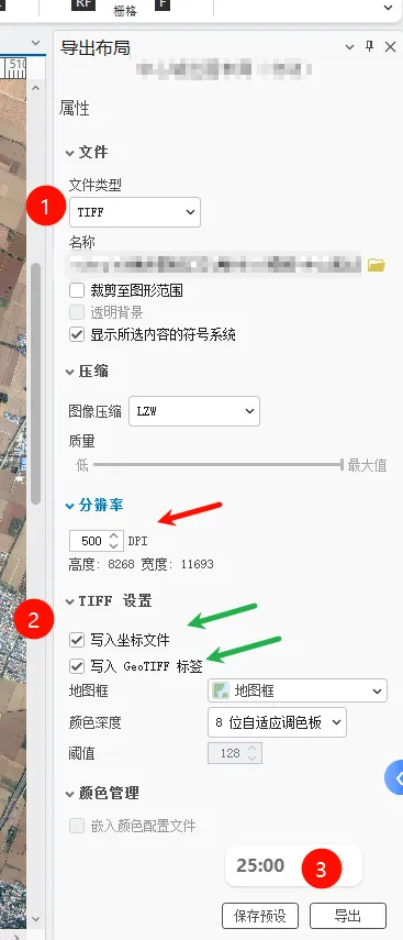 影像必须是投影坐标,在【导出布局里文件类型设置【tiff】,【分辨率】按需填写,越大越清晰,TIFF设置全部勾选,点击【导出】