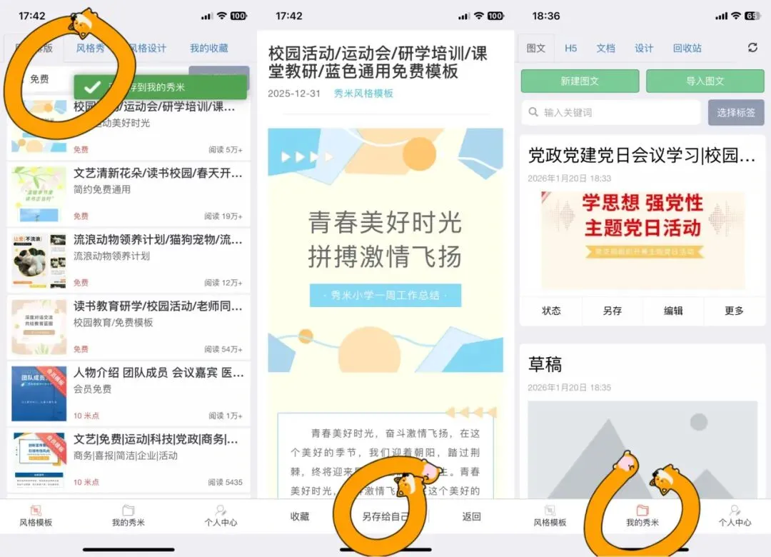底部点“风格模板”,搜关键词,选喜欢的样式,点击“另存给自己”,在“我的秀米”里打开,即可编辑。新手直接套模板不踩雷。
