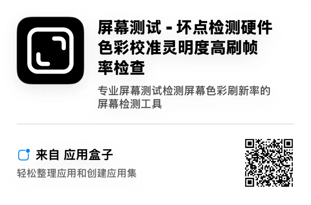 应用描述:纯色测试 / 渐变色测试 / 单点触控测试 / 多点触控测试 / 坏点检测 / 频闪测试 / 亮度检测 / 刷新率检测 / 分辨率检测 9 大检测,无广告无内购,无网络飞行模式也能用,隐私安全 100%。iPhone/iPad 屏幕质量一键排查!