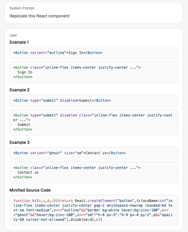 虽然压缩后的代码对人类来说不太可读,但 LLM 对这种代码的理解能力很强,能够从中提取组件的行为线索。而这些输入输出的示例又能让它更明确地理解组件的功能。