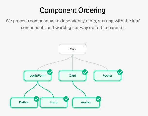 因此,我们需要按照依赖关系的顺序来处理组件。从最底层的叶子组件开始 —— 这些组件不会再包含其他自定义组件。然后再逐步向上构建父级组件。