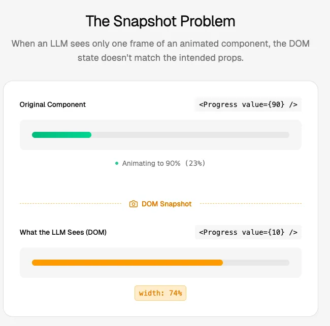 我们的 LLM 会正确生成一个 value={90} 对应 width: 90% 的组件,但这和当时的快照不匹配!原因是我们只对比了页面某一帧的静态状态,而原组件实际上在动画中。