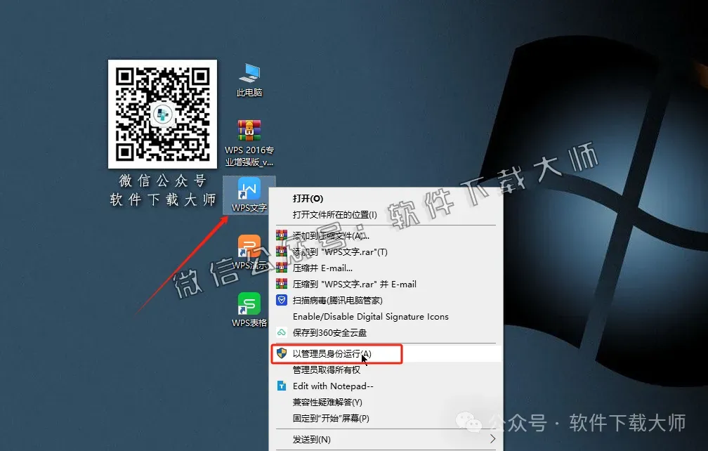 1.解压安装包:①鼠标右击【WPS 2016专业增强版_v10.8.2.7119.exe】压缩包②选择【以管理员身份运行】(亦可用电脑上安装的解压软件(如:360压缩)解压)。