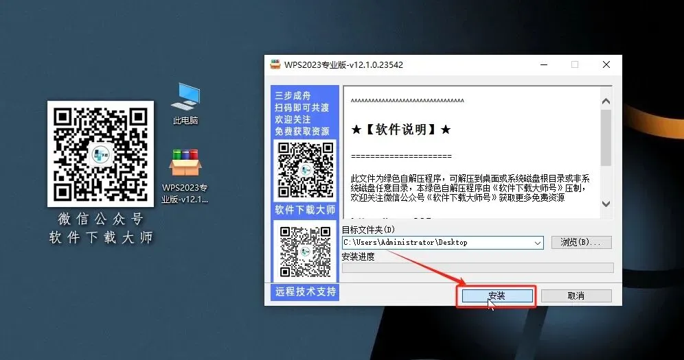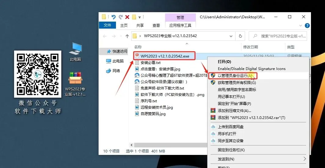 1.解压安装包:①鼠标右击【WPS2023专业版-v12.1.0.23542.exe】压缩包②选择【以管理员身份运行】(亦可用电脑上安装的解压软件(如:360压缩)解压)。