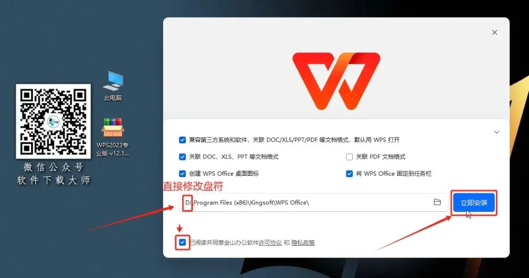 6. 选择软件安装路径,建议和教程中的保持一致,本例安装到D盘(将路径地址中的首字符C改为D表示安装到D盘,安装路径不要出现中文),勾选【已阅读…】,点击【立即安装】