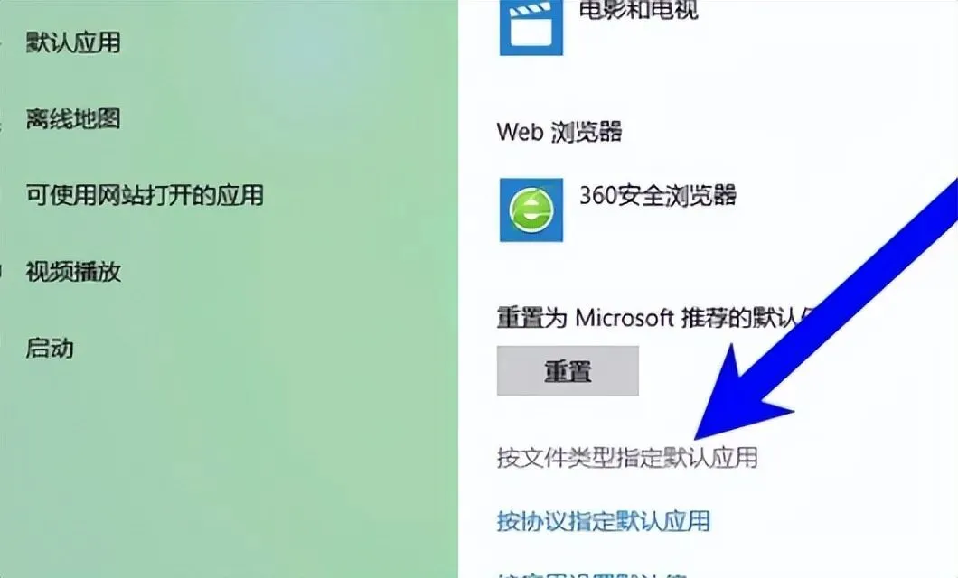 4、点击右侧中的”按文件类型指定默认应用”。