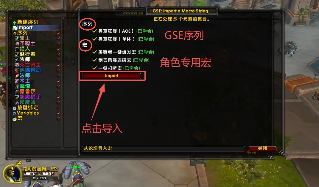 5️⃣点击”lmport” 导入,导入后会弹出此字符串所包含的所有内容【确认无误后点击导入即可生成GSE序列及通用角色宏】