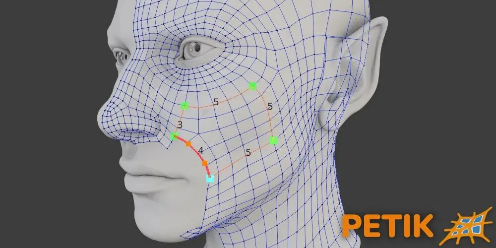 Petik可以快速重拓扑,自定义修改面片的位置边数,最多支持到六边形,每条边上的顶点数量可变