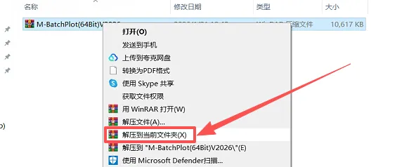 ①鼠标右击【M-BatchPlot(64Bit)V2026】压缩包②选择电脑上安装的【解压软件】③点击【解压到当前文件夹】。