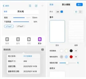它支持多个模板,包括:康奈尔横线、康奈尔网络、麦肯锡、五线谱等,也支持自定义模板,包括:空白、线条、网格、点状、尺寸、背景颜色、辅助线颜色、辅助线间距。