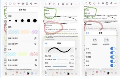 其中钢笔选项包括:笔头尖度、压力灵敏度、粗细、不透明度,套索选项包括:任意图形、规则图形,胶带样式包括8种唯美图案。