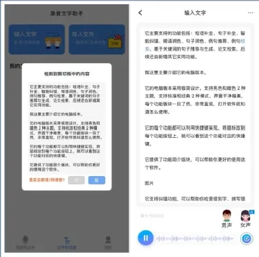 其中语音转文字功能支持录音转文字和音频文件转文字,文字转语音功能支持输入文字转语音和导入文件转语音。