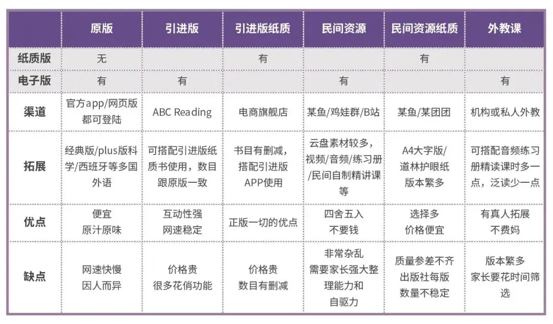 缺点:服务器在国外,网速慢一点。优点:官方最原汁原味,版本从经典版到plus,各种外语/科学专属版块都可开通,除了阅读,文章后还有各种练习和测试,做的题家长可直观看到成绩。每个板块年费约100多美金一年,团购平均下来一年一百多,一个月才十几块。