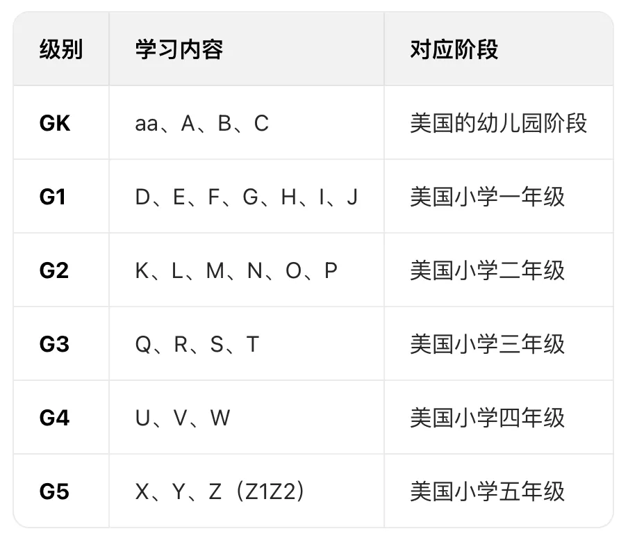 RAZ官方把这29个级别,按照阅读水平划分了四个大的发展阶段,每个阶段所对应的级别和能力大致如下: