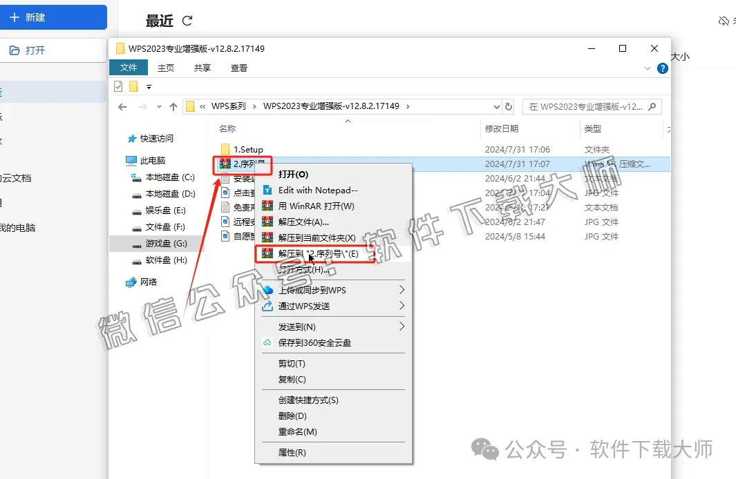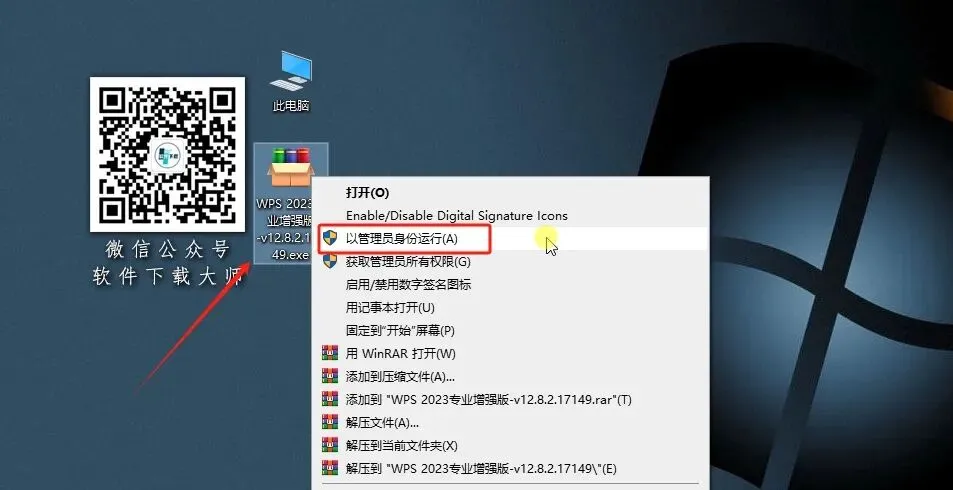 1.解压安装包:①鼠标右击【WPS 2023专业增强版-v12.8.2.17149.exe】压缩包②选择【以管理员身份运行】(亦可用电脑上安装的解压软件(如:360压缩)解压)。