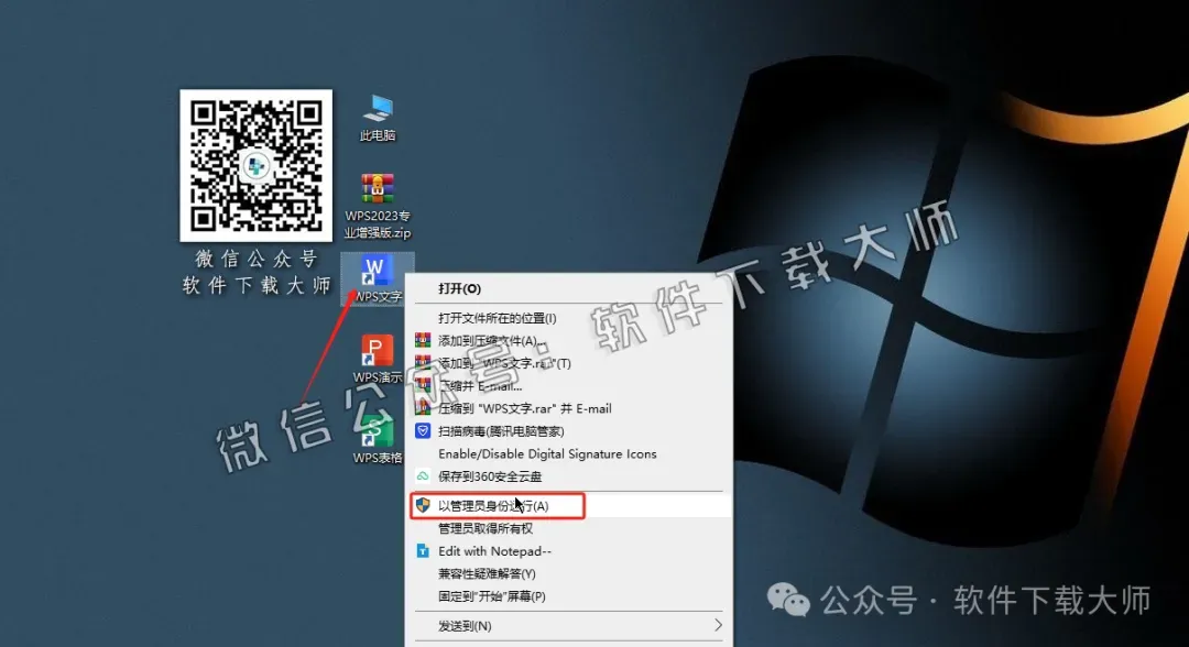 7.安装完成后,鼠标右击桌面【WPS文字】图标,选择【以管理员身份运行】。