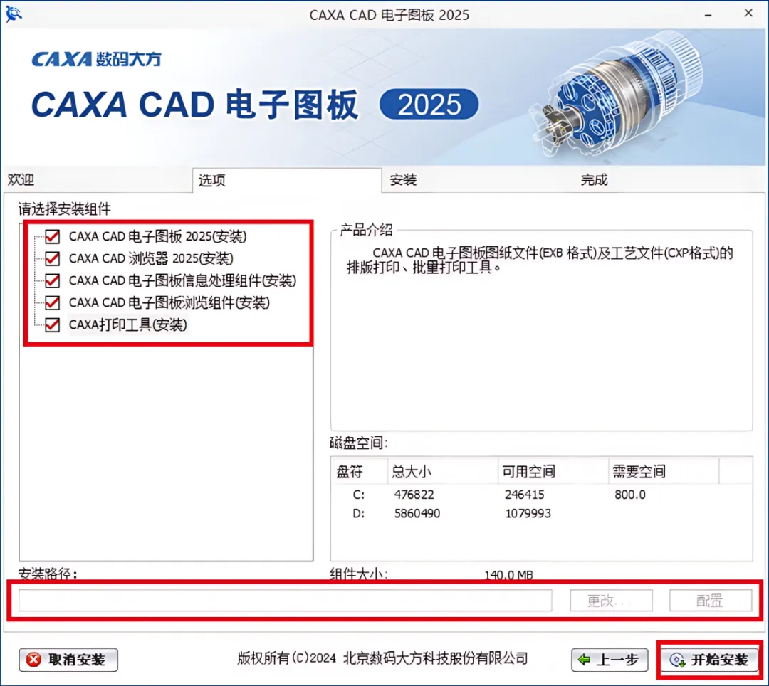 5.按需勾选组件【CAXA CAD 电子图版 2022(安装)】。CAXA软件漠然安装路径为系统C盘里,点击【更改】可设置安装路径。设置好安装路径后点击【开始安装】。