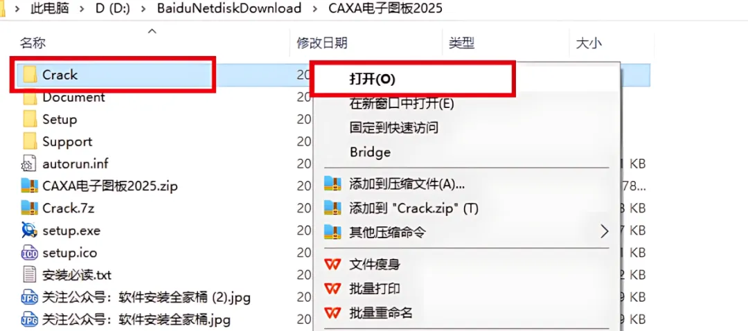 8.返回到解压的【CAXA 2025】文件夹中,鼠标右击打开【Crack】文件夹