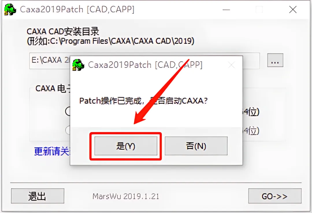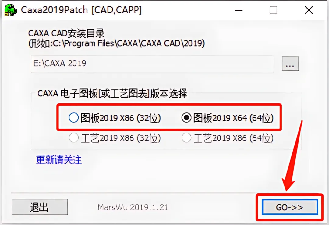 13.根据自己电脑系统的操作位数选择对应的CAXA版本,教程中选择【图版2019 X64(64位)】,然后点击【GO】。