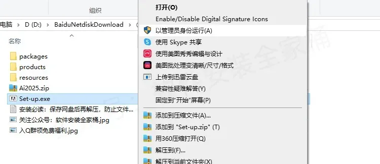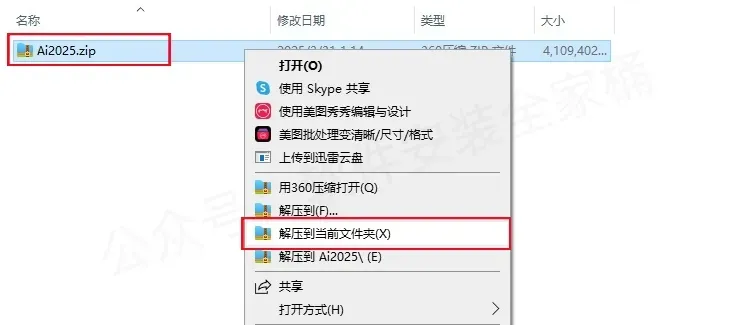 1.打开下载的AI 2025软件安装包,鼠标右击压缩包选择【解压到当前文件夹】。