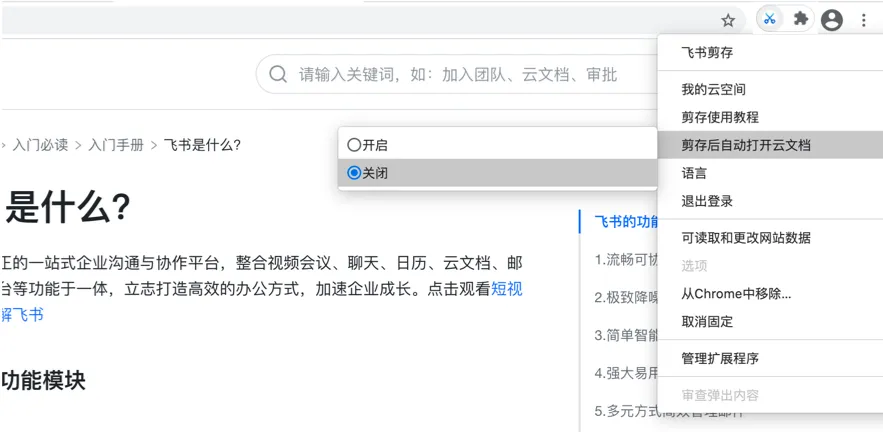 不过有个小遗憾,不能剪存飞书自己的文档。如果需要提取飞书文档内容,可能得用其他方法。实测效果上周三我测试了一下,剪存了10个不同类型的网页。这篇知乎回答,点一下插件,大概2秒钟保存好了。打开飞书文档看,文字、图片、引用格式都留着,比手动复制粘贴强多了。还有这篇小红书笔记,图文并茂的,剪存后图片都在,图片里的文字也能识别。最惊喜的是百度文库那个网页,本来禁止复制的,插件直接把内容提取出来了,挺意外的。10个网页剪存大概花了10分钟,比手动复制粘贴快不少。这个提升挺明显的。一些小技巧用了一段时间,发现几个小技巧挺实用的。关闭自动跳转前面提到了,剪存后会自动打开飞书文档。如果你要连续剪存好几个网页,这个自动跳转会挺烦的。建议关闭它,剪存完后再统一去飞书文档里查看。右键点击插件图标就能找到这个选项。批量剪存如果你需要剪存很多网页,可以先把这些网页都打开在不同的标签页里,然后一个一个点插件剪存。这样不用每次都重新打开网页,效率会高一些。分类整理剪存的内容会保存到飞书云文档里,建议建个专门的文件夹,比如”资料收集”,把剪存的内容都放进去,这样以后找起来方便。不过这点飞书剪存做得不太好,它不会自动帮你分类,文档散落在云文档里,需要你自己整理。这个倒是个小遗憾。和其他工具比怎么样?我之前用过几个类似的工具,比如Obsidian的Web Clipper。对比下来,飞书剪存有几个优势:云存储,剪存的内容不会因为换设备就没了。多设备联动,登录同一个飞书账号,哪里都能看。支持多个浏览器,Chrome、Edge、360这些都能用。但也有缺点:从飞书应用打开文档的路径有点长,不直观。文档没有自动分类,容易乱。不支持Safari,Mac用户用Safari比较麻烦。怎么选,看你需求。喜欢云存储、多设备方便,飞书剪存挺合适。喜欢本地存储、需要灵活自定义模板,Obsidian Web Clipper可能更适合。适合谁用?这个工具挺适合几类人:经常收集资料的人,比如写作者、研究员、学生。做知识管理的,想把网页内容系统化整理。不想花时间在重复劳动上的人。收藏夹里有一堆失效链接,或者经常要手动复制粘贴,这个工具确实能帮你省不少时间。总结一下飞书剪存这个插件,把复杂的资料收集流程简化成一个点击动作。不是什么黑科技,就是解决日常高频的痛点。这么简单的东西,用下来效率提升确实挺明显。我的体会是,好工具不一定功能多,而是能精准解决你的问题。复制粘贴不是大问题,但每天重复几十次,那就成了大问题。这时候,一个简单的插件就能改变很多。如果也被这种重复劳动搞得挺烦的,不妨试试这个插件。3分钟就能学会,从此告别复制粘贴。对了,插件是免费的,飞书账号也是免费注册的。下载地址:https://chromewebstore.google.com/detail/飞书剪存/mofcmpgnbnnlcdkfchnggdilcelpgegn小博主,非广告,真心好用,如果你是飞书重度使用患者!真心推荐!!如果有遇到问题,也可以在评论区说,我看看能不能帮上忙。谢谢大家的阅读时间,如果文章对你有帮助,点个“在看”和关注。也可以转发到朋友圈,你的肯定,是我继续输出的动力,祝你好事花生!