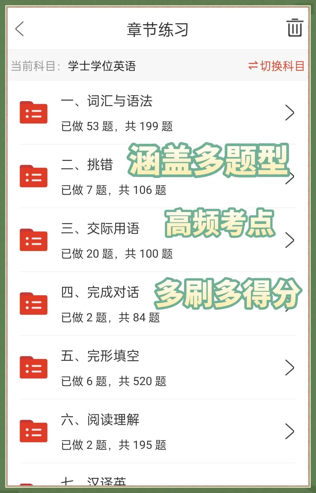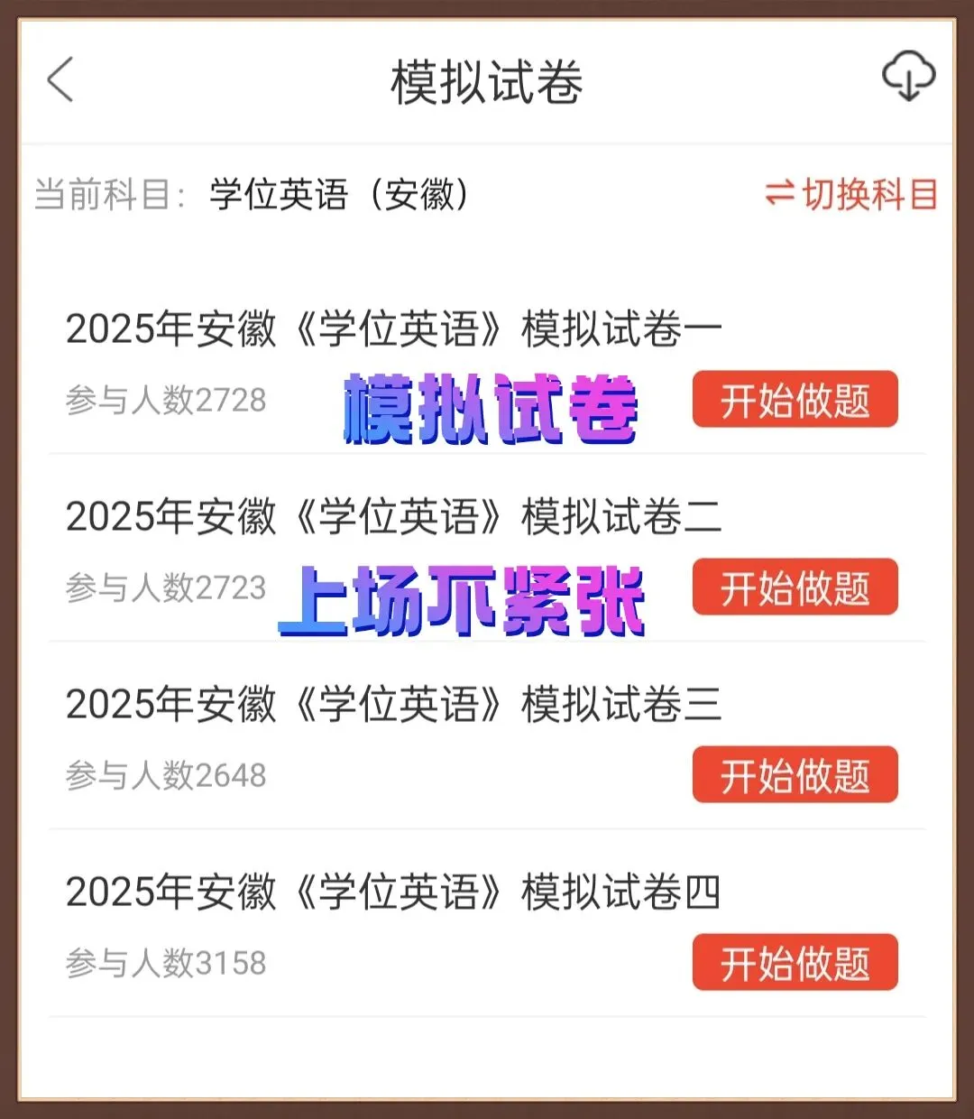 • 多版本海量题库:这个 app 有针对 2025 年学士学位英语的多种版本题库,全国版、高教版、国开版、广东版等等,无论考生考哪个版本,都能找到对应题库