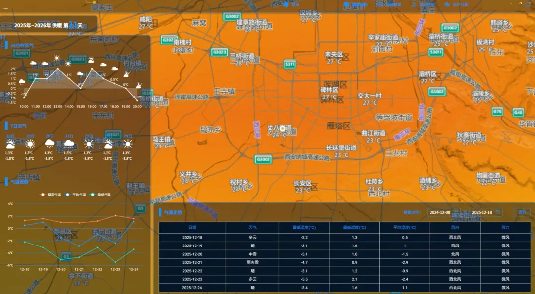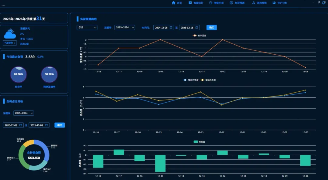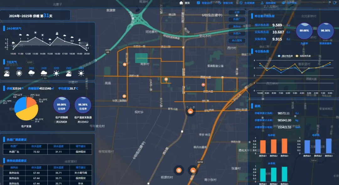 基于 AI 室外温度预测与供热负荷算法,结合用户端室温数据,自动生成热源 – 换热站 – 管网三级热力调度方案,实现供热流量、压力、温度的动态调节; -