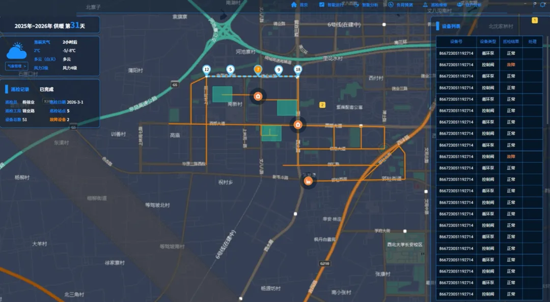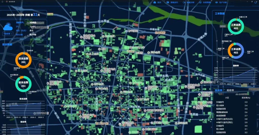 构建全维度故障预警体系,对管网漏损、换热站设备故障、热力参数异常、室温超标等问题实现秒级感知、分级预警、定位精准,并联动运维工单系统自动推送处置任务,将故障响应时间从小时级缩短至分钟级,大幅降低故障对供热的影响。