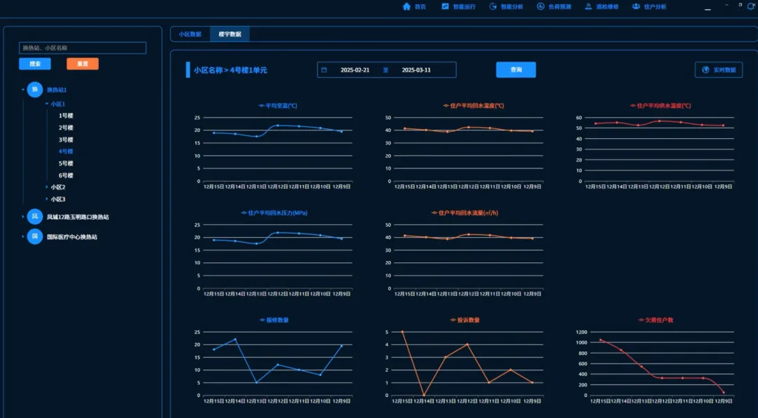 实时采集居民室内温度数据,支持按小区、楼栋、单元、户号精准查询,生成室温变化趋势曲线与区域室温分布热力图,直观展示室温均衡情况; -