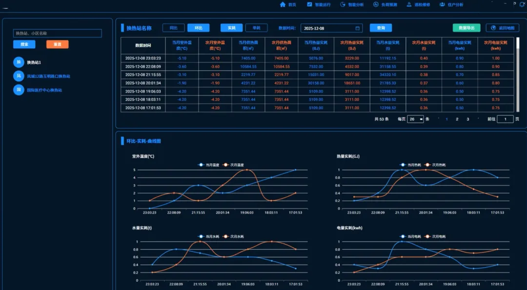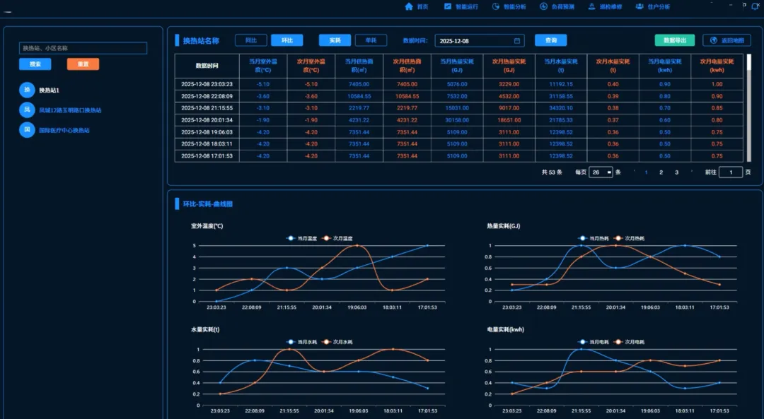 生成能耗分析报表与趋势曲线,自动识别高能耗区域与设备,分析能耗异常原因,提供节能优化建议(如调整换热站运行参数、优化管网保温等); -
