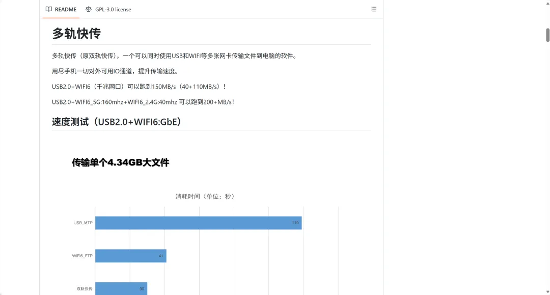 多轨快传是一个可以同时使用USB和WIFI等多张网卡传输文件的软件,支持手机电脑互传,两台手机互传(需要电脑作为中转),用尽手机一切对外可用IO通道,提升传输速度,快到难以想象!