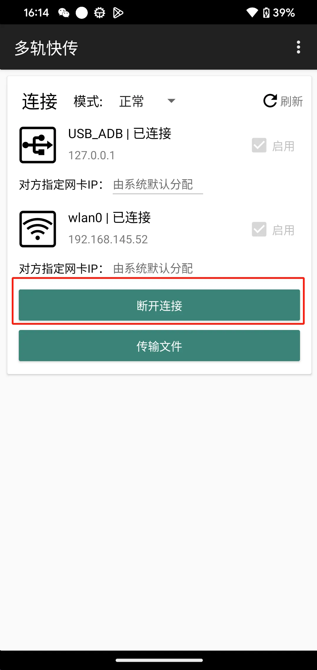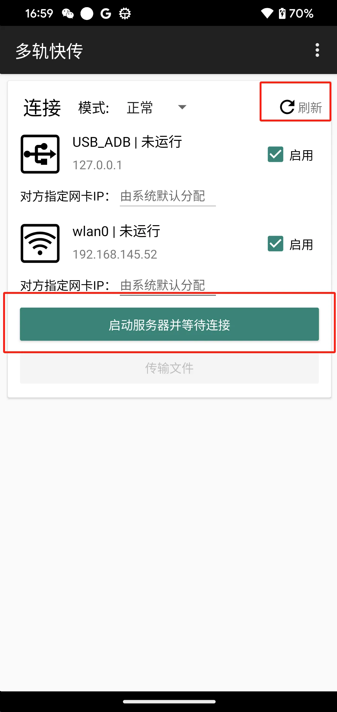 (3)手机端打开多轨快传APP,点击右上角“刷新”,出现USB_ADB和网卡后再点击“启动服务器并等待连接”
