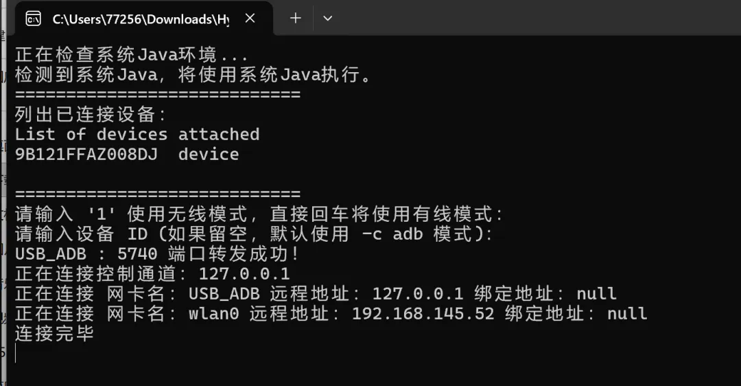 列出已连接设备为连接的手机(如果没有,检查USB调试是否开启),两次回车,连接完成