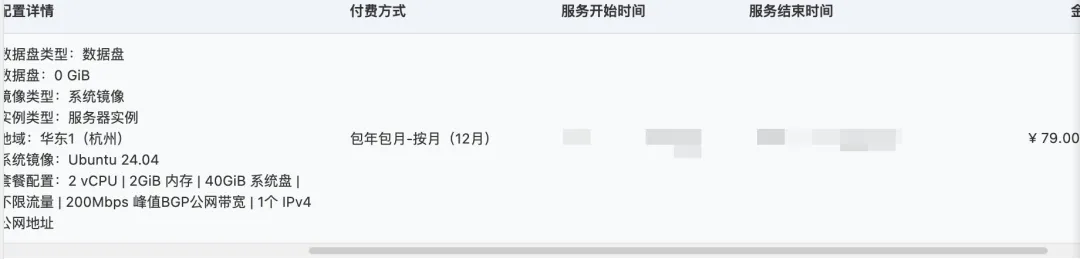 备案的前提是要有域名和国内轻量云服务器,个人开发者不用买高配,满足基础需求即可,整体成本百元内就能搞定,以下是阿里云的实际购买成本参考,腾讯云价格相差无几: