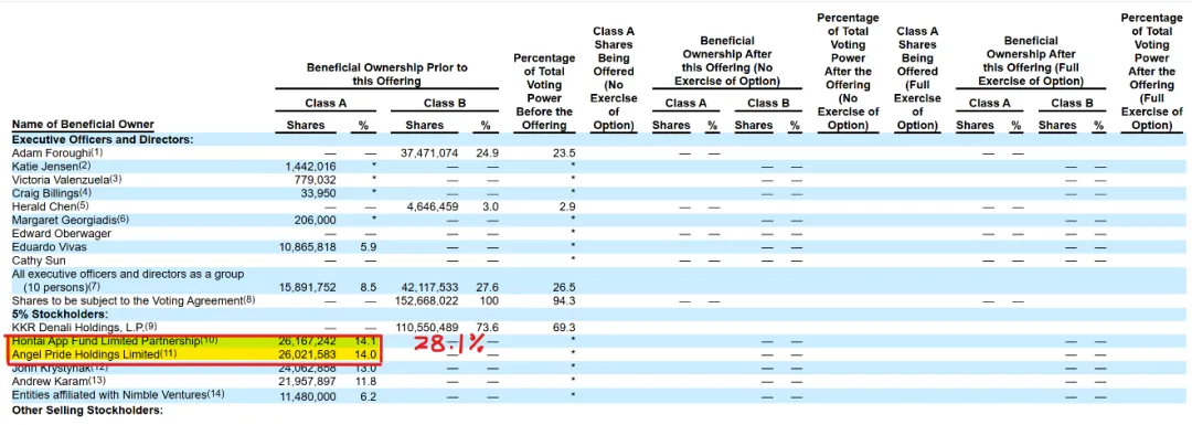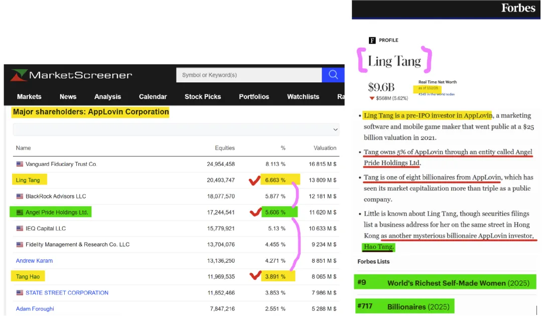 唐浩并非散户,而是核心内部人:根据我们的深度穿透调查和 SEC 文件,在AppLovin IPO的时候,唐浩通过 Discovery Key Investments、Midterm Success 以及其家族成员唐玲(Ling Tang)控制的 Angel Pride Holdings,合计控制了 AppLovin 约 28.1% 的股权 。
